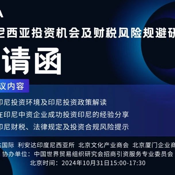 尊敬的嘉宾: 我们诚挚邀请您拨冗莅临由利安达国际联合北京文化产业商会、北京厦门企业商会、北京泉州商会和利安达印度尼西亚所等共同主办,中国世界贸易组织研究会招商引资服务专业委员会协办的“印度尼西亚投资机会及财税风险规避”研讨会。本次研讨会拟定于2024年10月31日以线上的方式召开,期待您的莅临。印度尼西亚是“21世纪海上丝绸之路”的首倡之地,也是共建“一带一路”的先行区。经过十一年的发展,“