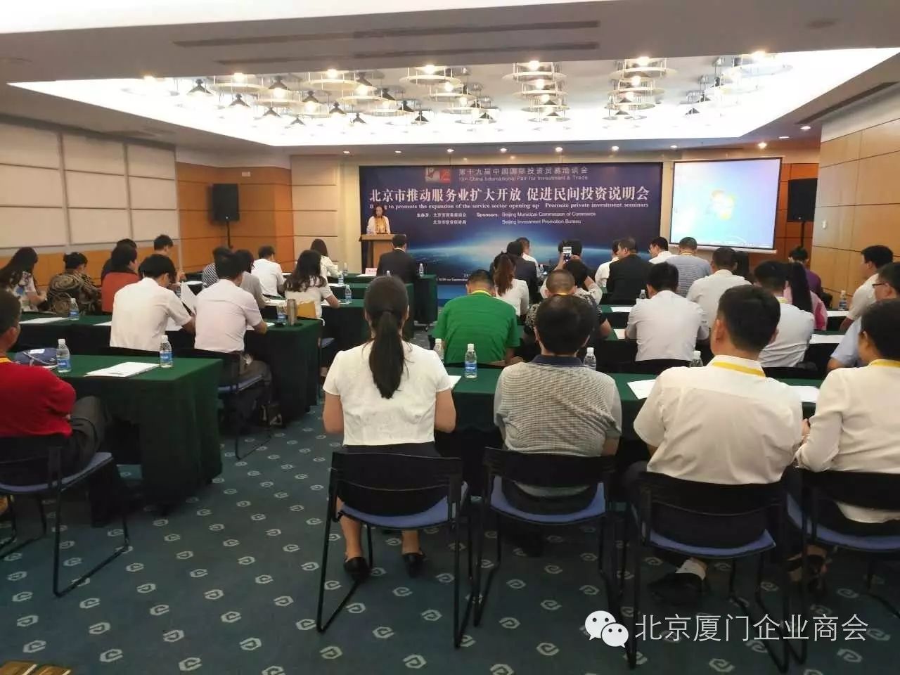 9月8日上午,由北京市商务局,北京市投资促进局主办的北京市推动服务业扩大开放,促进民间投资说明会在厦门市会展中心举行,我商会考察团在会长李进基的带领下应邀出席了此次会议。