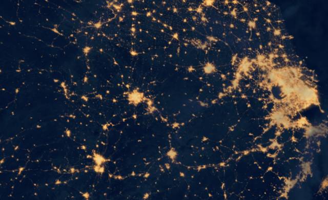 各城市群实力又如何,我们可以从nasa提供的卫星灯光图中比较一二。