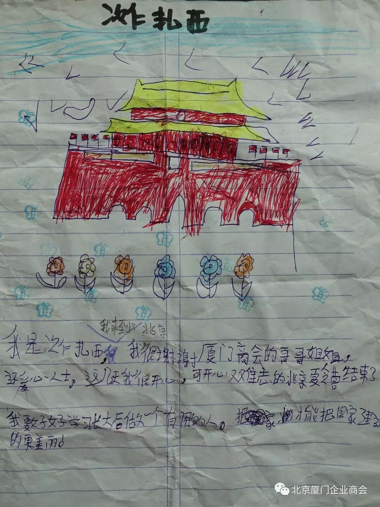我是次仁扎西,我来到了北京。我很谢谢厦门商会的哥哥姐姐,还有爱心人士。这几天我很开心,可开心又难忘的北京夏令营结束了,我要好好学习长大后做一个有用的人,才能把国家建的更美丽。