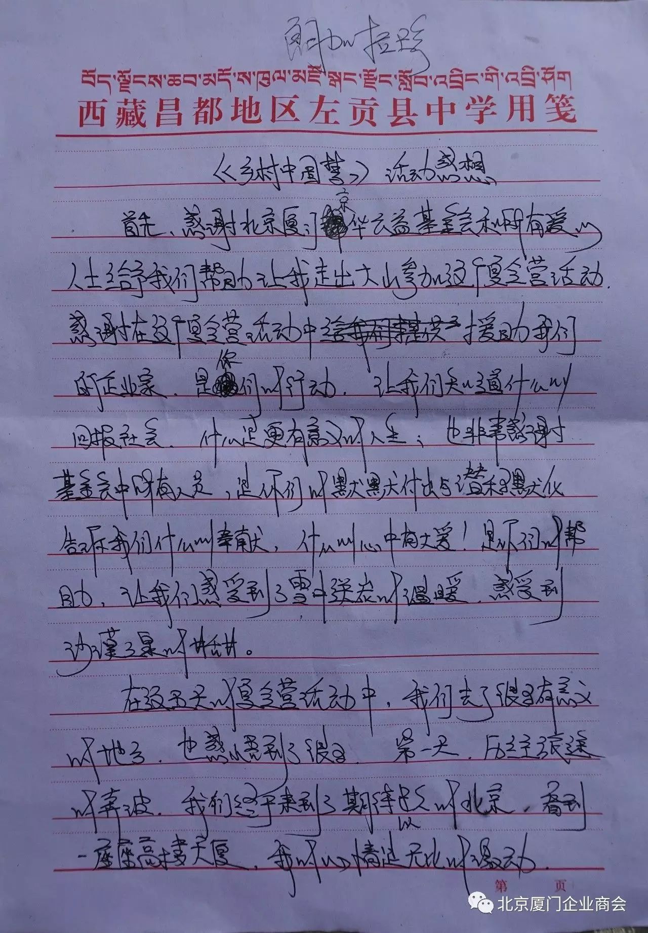 感谢厦门商会、京华公益基金会和成功人士、爱心人士,能让我走出大山,面向世界,参加这次乡村中国梦心爱素拓活动。在这短短5天的时间里,我看到了很多,也学到了很多,到了许多企业公司,董事长给我们讲了许多人生经验。我对自己说,同样是在农村长大的野孩子,为什么他们就可以取得那样的好成就,这是因为,他们比别人努力了100倍,这使我对爱因斯坦说的成功是由1%的天赋加99%努力组合而成的,有了更深一步的了解。妈妈们都说,我们来北京不是来参观,而是来军训的,我们大家都明白这一点苦不算什么,重要的是提高了自己的素质,这就是本次活动的目的。我在这五天里最开心的一天是去秀水街的一天,因为在这一天里,我增加了一份自信,多了一份勇气,而且最遗憾的这件事情,永珠洛布也说了,只看了鸟巢和水立方的外观,但是我们理解你们。
