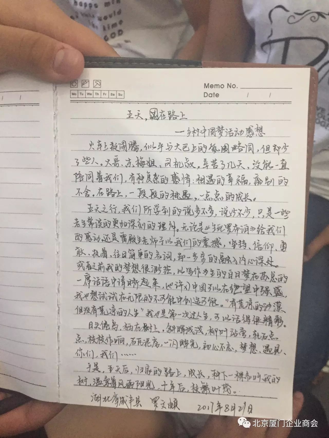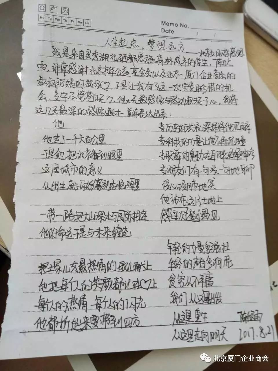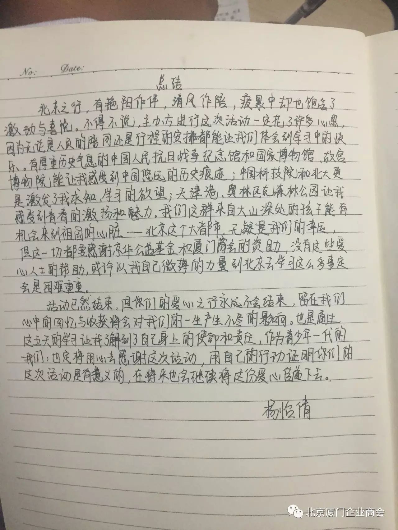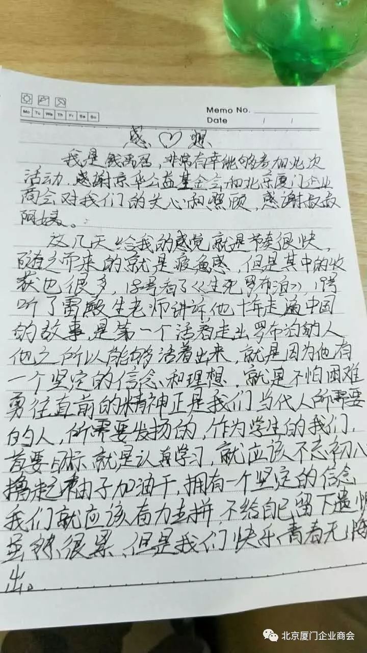 ‘吃水不忘挖井人’由衷的感谢北京厦门商会的叔叔阿姨以及热心的志愿者,给了我这样一次难得的机会。真心的感谢。祝叔叔阿姨以及所有的爱心人士身体健康,事业有成!
