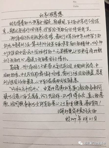 北京之行,有艳阳相伴,清风作陪,疲惫中也饱含了激动和喜悦。不得不说主办方进行这次活动肯定花了许多心思,因为无论是人员得陪同还是还是行程得安排都能让我们体会到学习中得快乐,有厚重历史气息得中国人民抗日战争纪念馆和国家博物馆,故宫博物院能让我感受到中国悠远的历史痕迹,中国科技院和北大更是激发了我求知、学习得欲望,天津港,奥林匹克森林公园让我感受到青春得激扬与魅力,我们这群来自大山深处得孩子,能有机会来到祖国得心脏——北京这个大都市,无疑是我们的幸运,但这一切都要感谢京华公益基金和厦门商会得赞助,没有这些爱心人士得帮助,或许以我自己微薄得力量到北京去学习这么多事定会是困难重重。