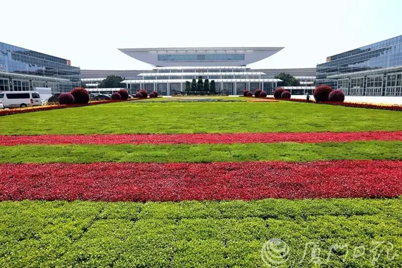 ▲厦门国际会展中心,鲜艳的花球、精心设计的绿雕营造出喜庆的氛围。