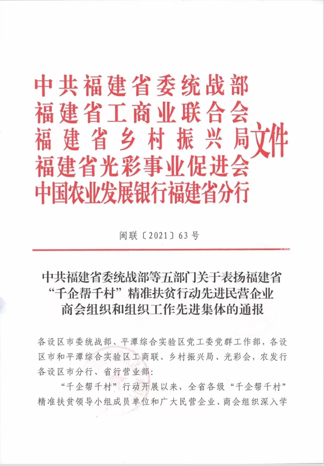 最近,中共福建省委统战部、福建省工商联、福建省乡村振兴局、福建省光彩事业促进会、中国农业发展银行福建省分行联合发文,对福建省“千企帮千村” 精准扶贫行动先进民营企业、先进商会进行通报表彰。其中北京厦门企业商会大力弘扬为党分忧、先富帮后富精神,踊跃投身全省“千企帮千村” 精准扶贫行动,聚焦精准扶贫、精准脱贫,积极参与产业扶贫、教育扶贫,作出了突出贡献,得到上级组织、领导及群众认可和表彰。