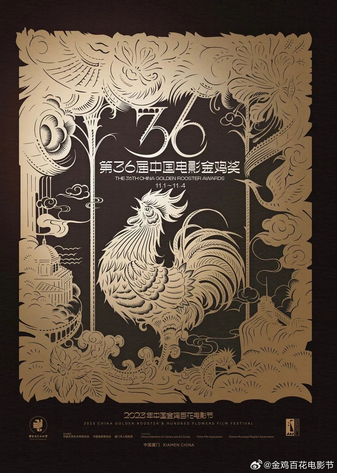 本届海报延续往届传统,以雄鸡图形作为主视觉的核心元素,以中国非遗技艺“剪纸”的形式展现中国电影的风采,用中国文化瑰宝,讲好中国故事。